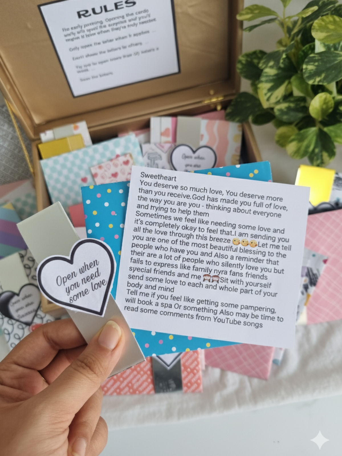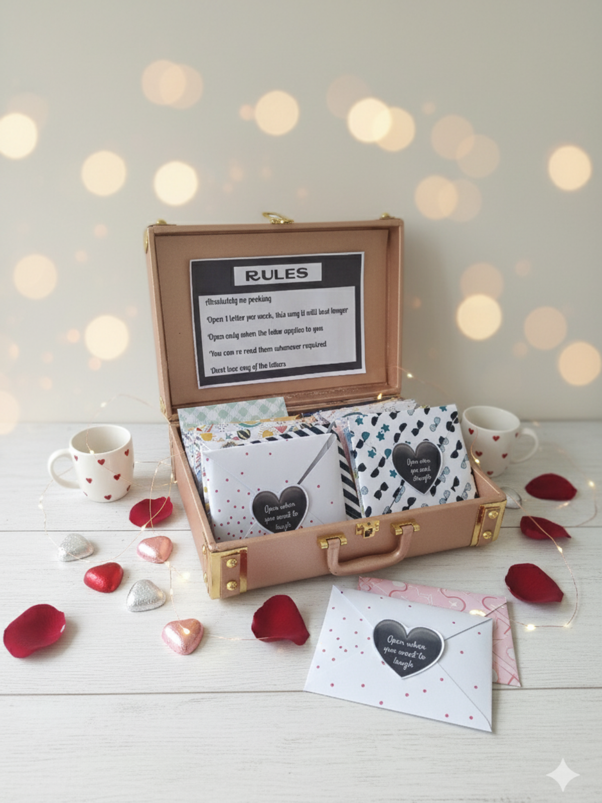 A heartfelt hamper filled with 30 unique “Open When” letters, each crafted to express emotions and create lasting memories. Perfect for long-distance relationships, anniversaries, or just to show someone how much they mean to you.