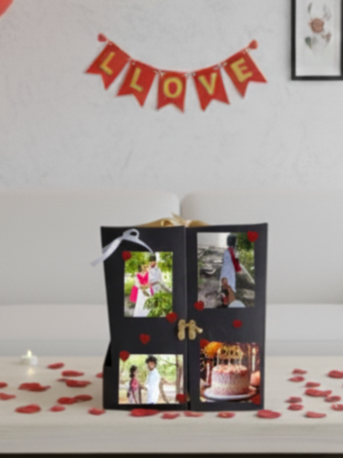 A delightful gift hamper designed to celebrate every special moment. Each box is filled The KitKat Treasure is the ultimate romantic display, designed to make your loved one feel truly special! This magnificent, three-panel gift box opens wide to showcase a personalized wall of cherished photos, illuminated by soft fairy lights. At the center lies a cake-style box made of KitKat chocolates, topped with lush red roses. The base includes a hidden drawer filled with even more treats. This is the perfect, grand gesture to celebrate your love, anniversary, or birthday in a completely unforgettable way!