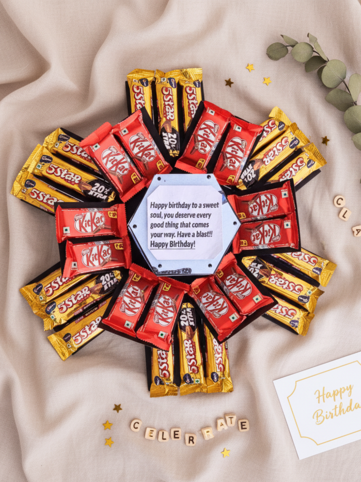 The Layers of Love is the ultimate, unforgettable sweet surprise! This magnificent black exploding gift box opens up dramatically to reveal layers and layers of premium chocolates, featuring an irresistible mix of KitKat, 5 Star, and Cadbury Crispello. At the heart of this indulgent display is a small white teddy bear and a tiny red surprise. It’s the perfect, luxurious way to show deep affection and make any anniversary or birthday truly memorable. Give them the gift of unforgettable sweetness today!