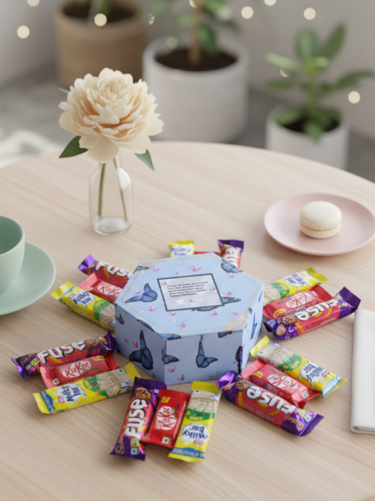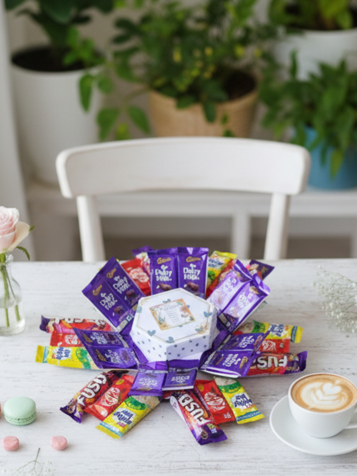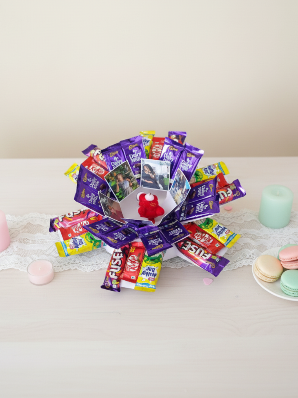 The Choco Rush is a guaranteed wave of happiness! This exciting exploding gift box bursts open to reveal a massive, irresistible assortment of the best Cadbury chocolates—including Dairy Milk, Fuse, KitKat, and more. At the heart of this chocolate storm, you'll find a cute mini teddy bear surrounded by a collage of your favorite personalized photos. It’s the ultimate, easy-to-gift surprise for the chocolate lover in your life. Stop searching and start celebrating—get the Choco Rush today!