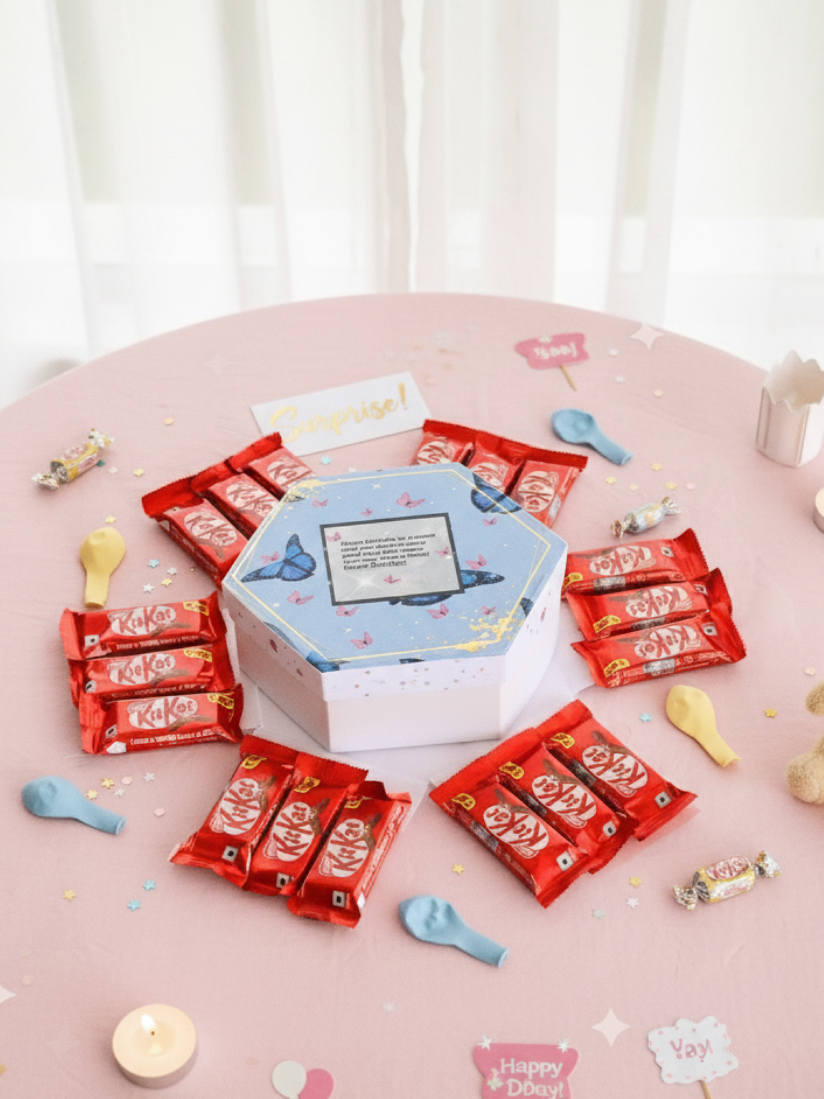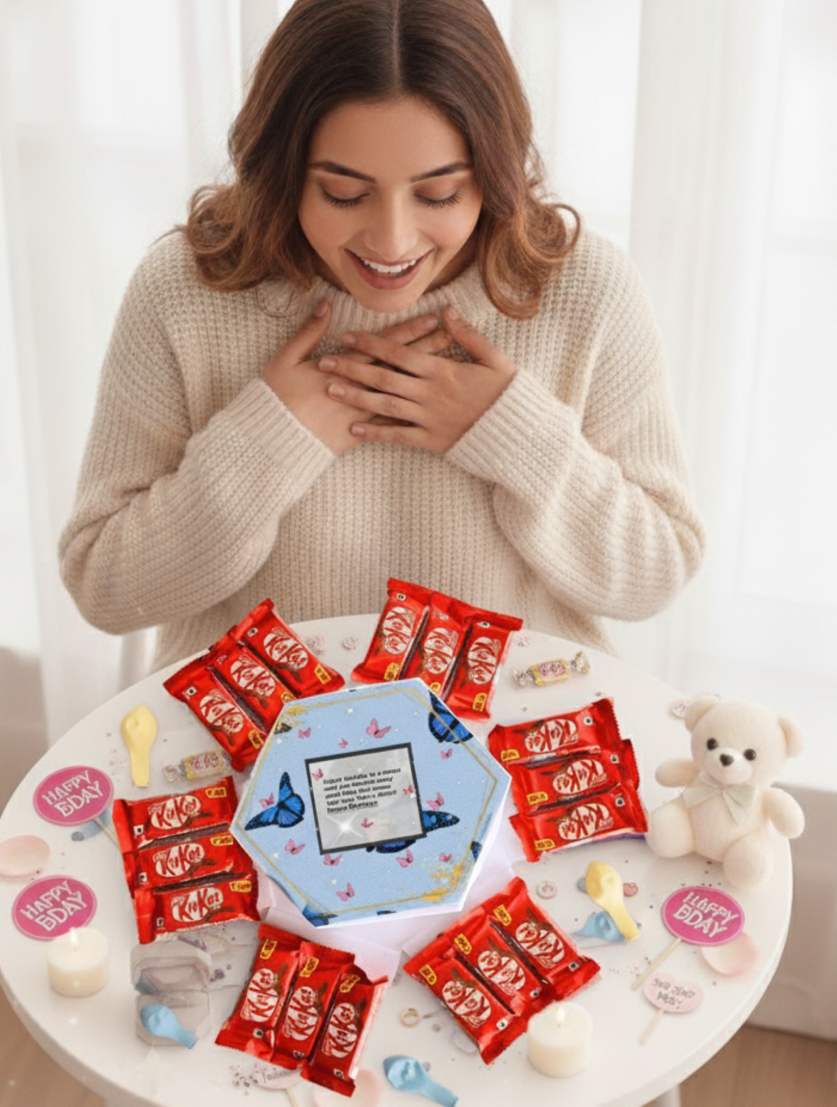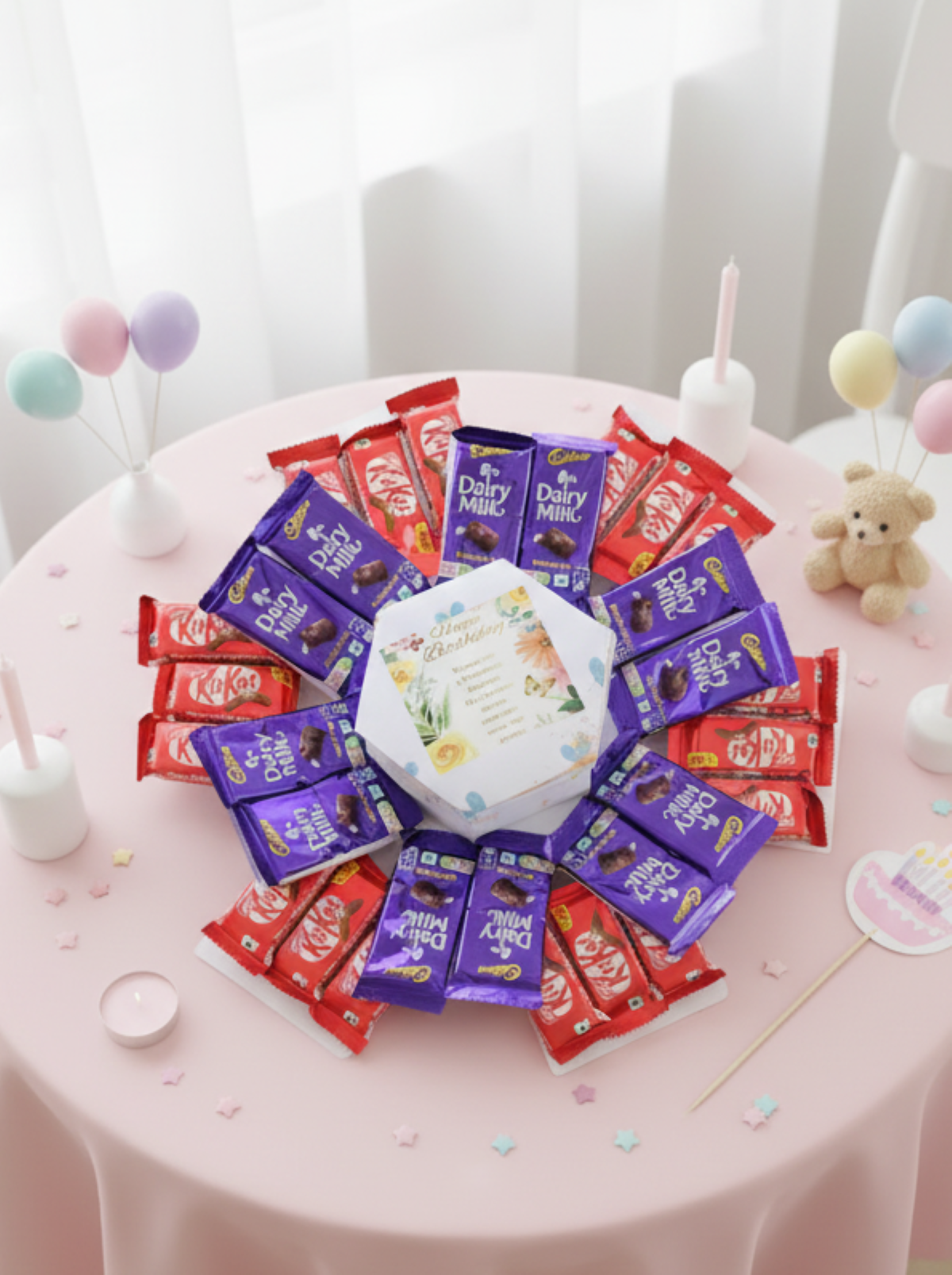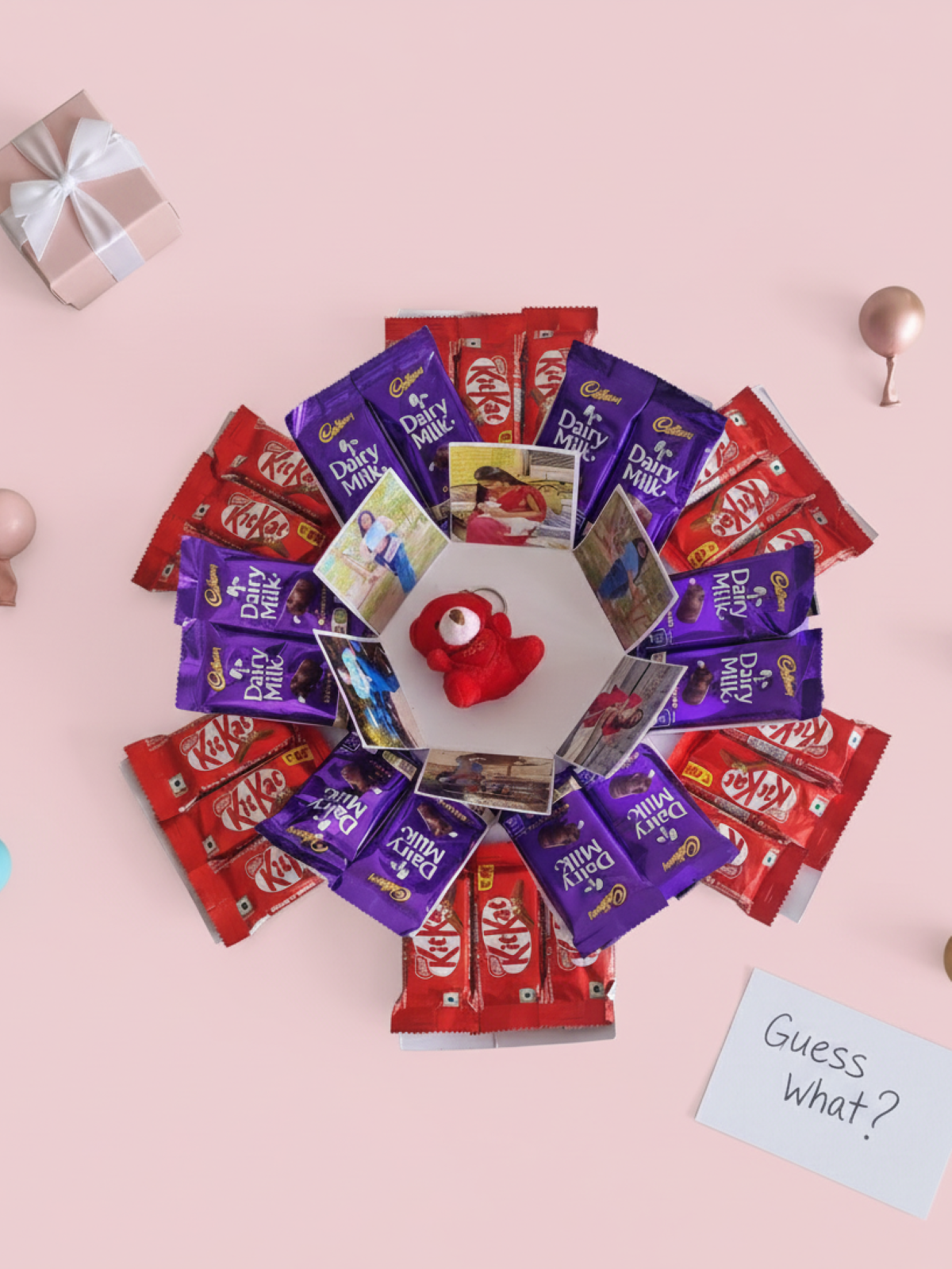 The Double Delight Explosion is a massive, sweet surprise that starts the celebration instantly! This amazing gift bursts open to show a spectacular mix of two classic favorites: KitKat and Cadbury Dairy Milk chocolates. Right at the heart of the blast is a cute red teddy bear surrounded by a collage of your best personalized photos. It's the perfect, fun, and easy way to send double the sweetness and memories. Send this exciting explosion today!