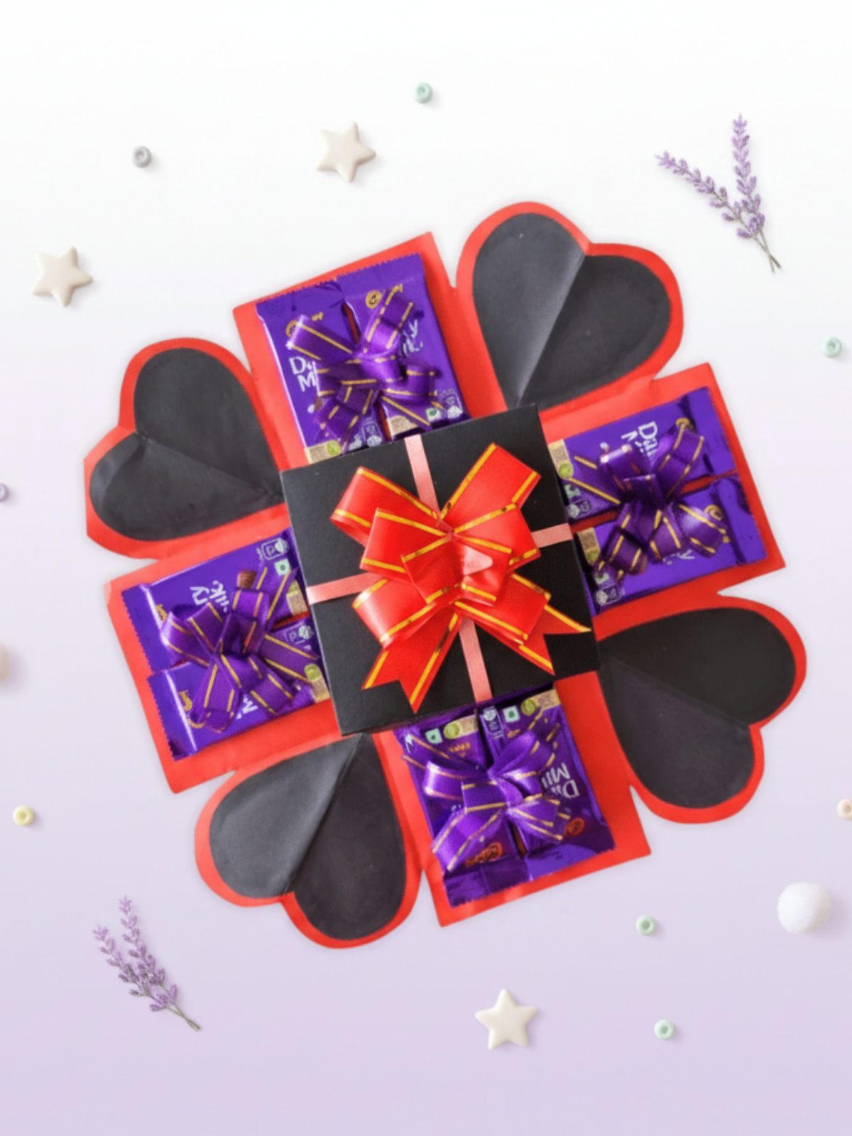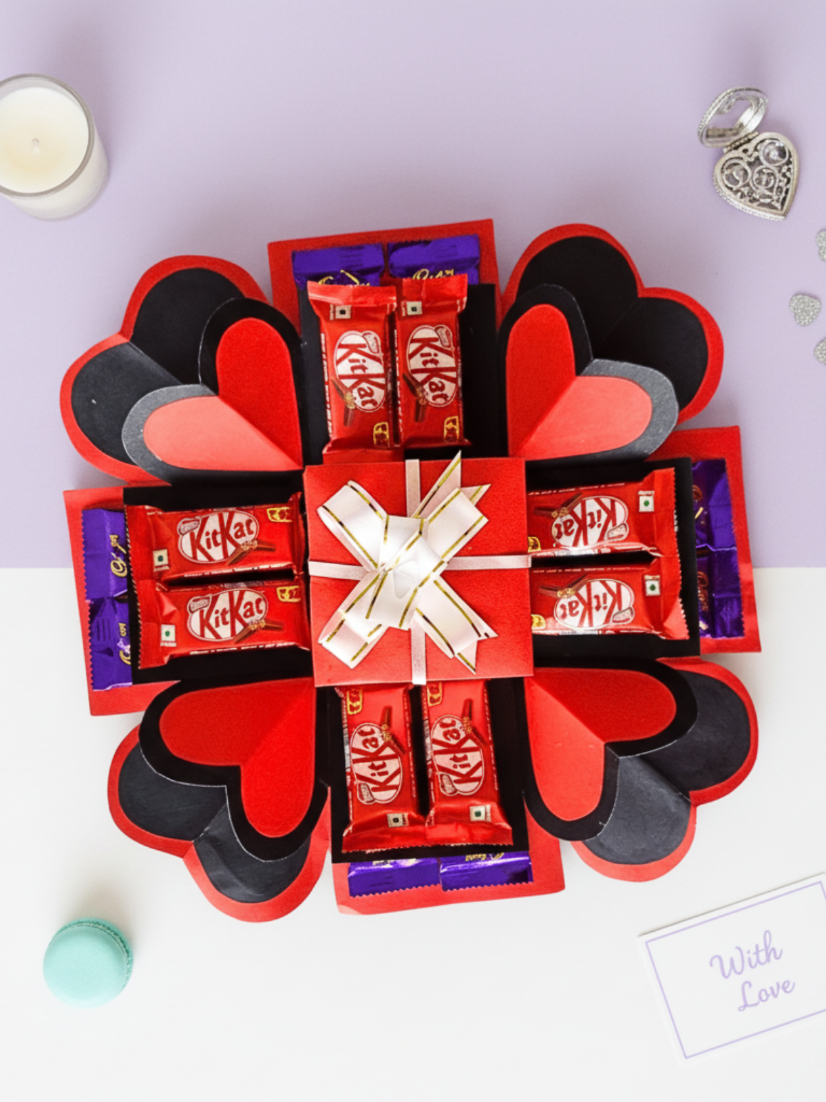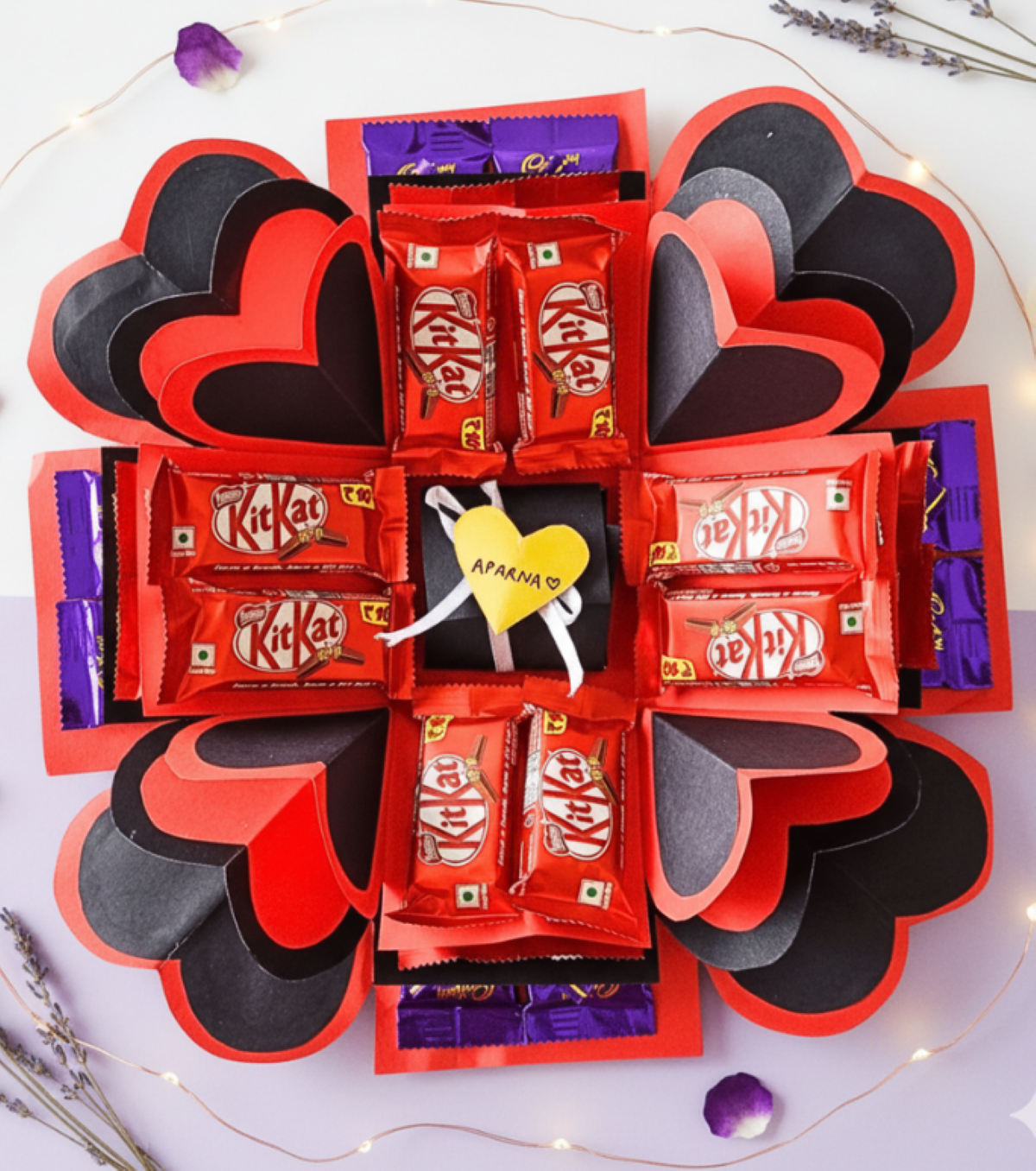 The Sweet Surprise Box is the perfect way to share your heart! This stunning exploding box reveals layers of beautiful red and black hearts as it opens. It’s packed with delicious KitKat and Dairy Milk chocolates and features a personalized yellow heart tag with a name like 'Aparna' on it. This unique, thoughtful, and charming gift is ideal for Valentine's Day, anniversaries, or just to send a special message of love.