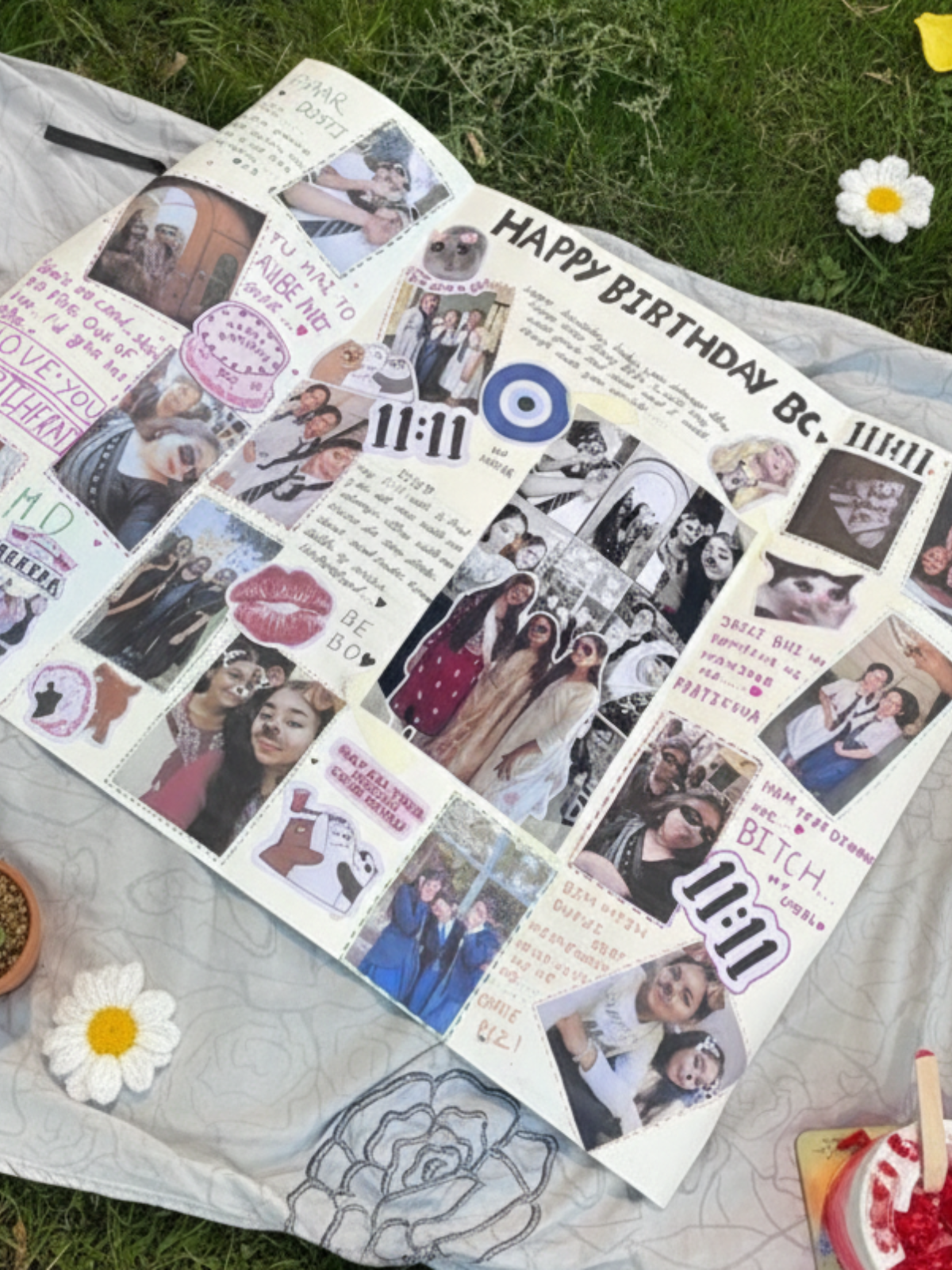 The Birthday Wishes memory sheet is the ultimate personalized birthday tribute! This large, beautifully designed collage is packed with personalized photos, heartfelt messages, and fun stickers that celebrate their life and your friendship. It's the perfect, unique keepsake that shows maximum love and effort!
