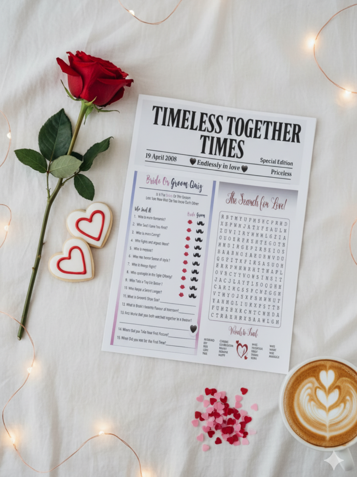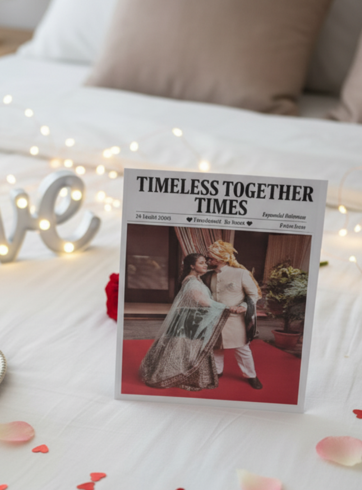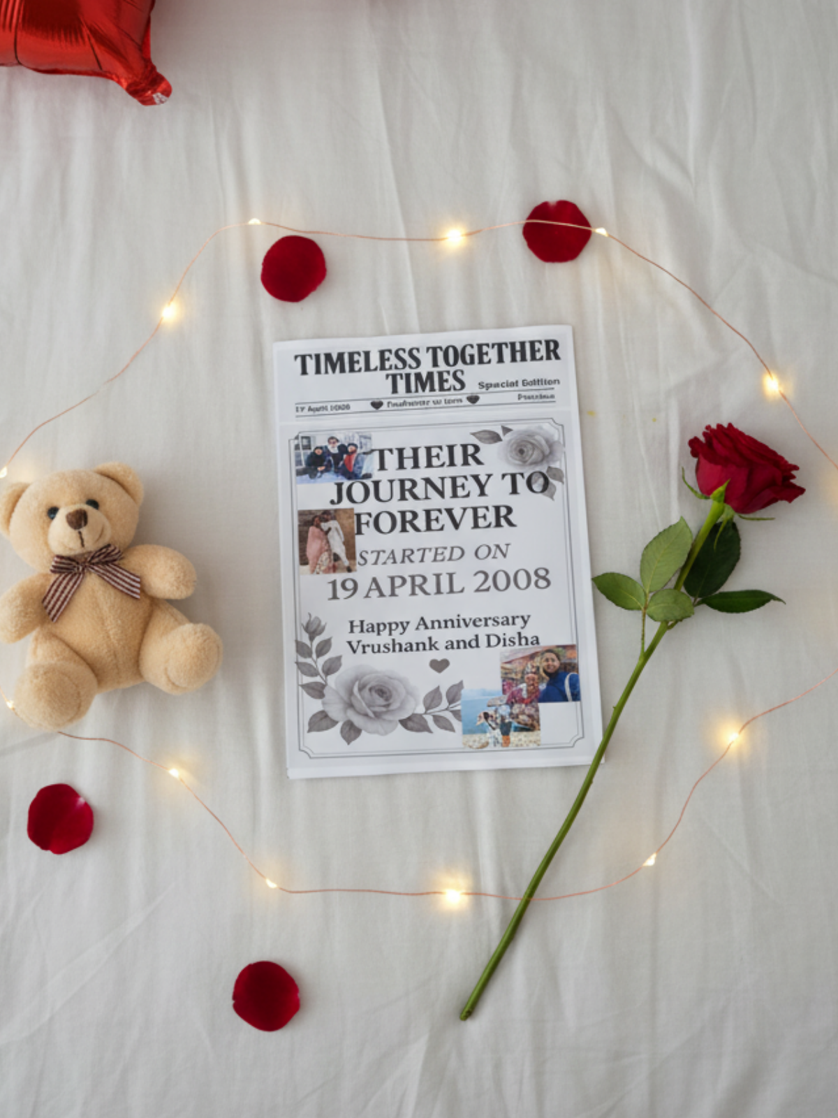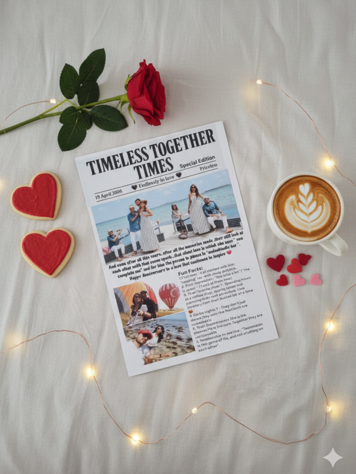 Celebrate love and togetherness with our The Anniversary Times — a beautifully personalized gift that captures your special moments. This elegant package includes 7 photos and 1 long custom message, featuring couple names and the special date for a truly memorable experience. Perfect for anniversaries, romantic surprises, or milestone celebrations, it’s a thoughtful way to honor your bond.