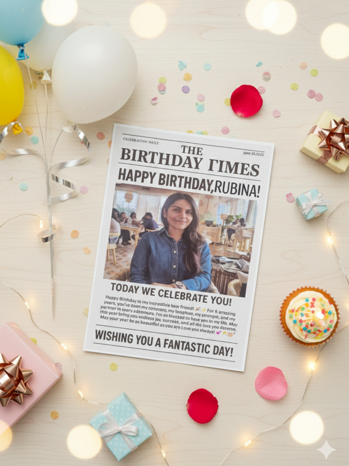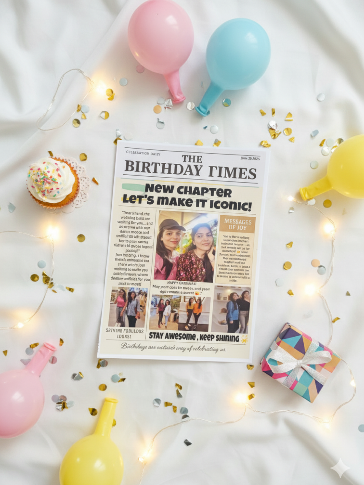 Make birthdays truly special with our The Birthday Times — a personalized gift that captures your love and memories in a creative way! This unique package includes 13 Photo along with 5 long personalized messages, crafted to bring smiles and joy. Perfect for birthday celebrations, milestone events, or heartfelt surprises, this elegant gift combines thoughtfulness, creativity, and love .