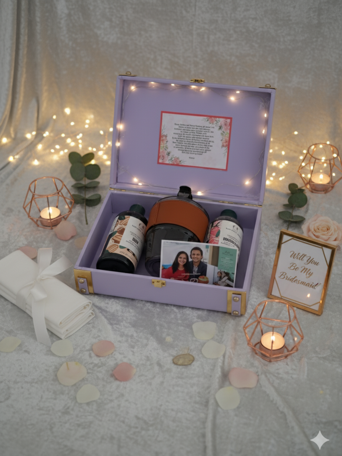 Make your bridesmaids feel truly special with our elegant Bridesmaid Bliss Box! A thoughtful keepsake that beautifully expresses your gratitude — featuring a personalized photo, a heartfelt note, bodyshop shower gel,coffee glass tumblr and a sweet chocolate treat-hersheys kisses pack. Perfect for wedding gifts, bridal showers, or to say “thank you” in the most memorable way!