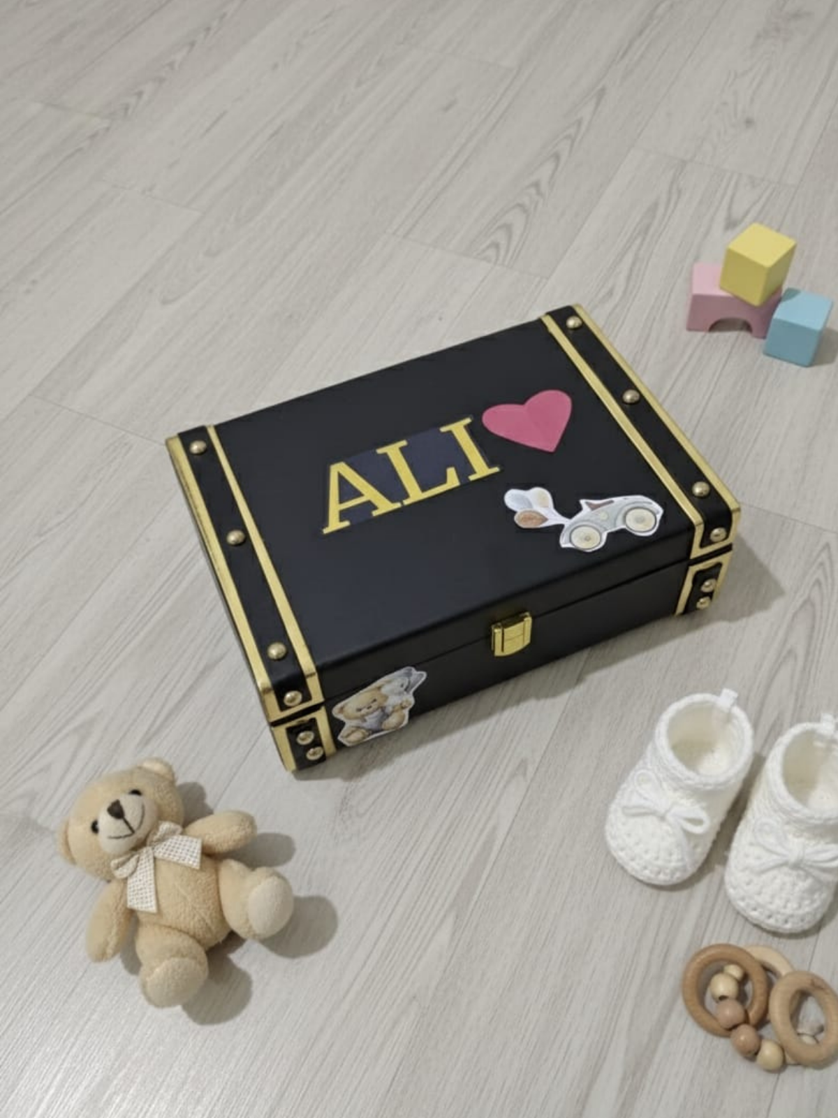 Keepsake Box: A stylish, sturdy black trunk-style box, which can be personalized with name.