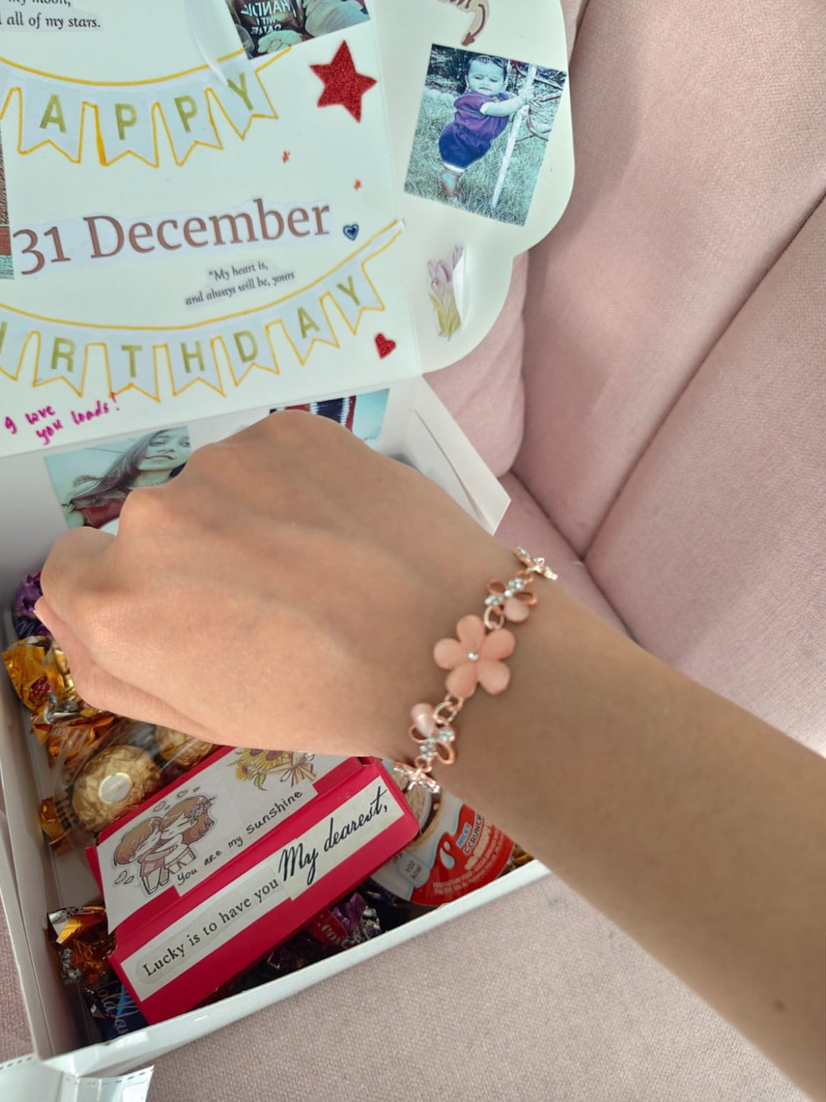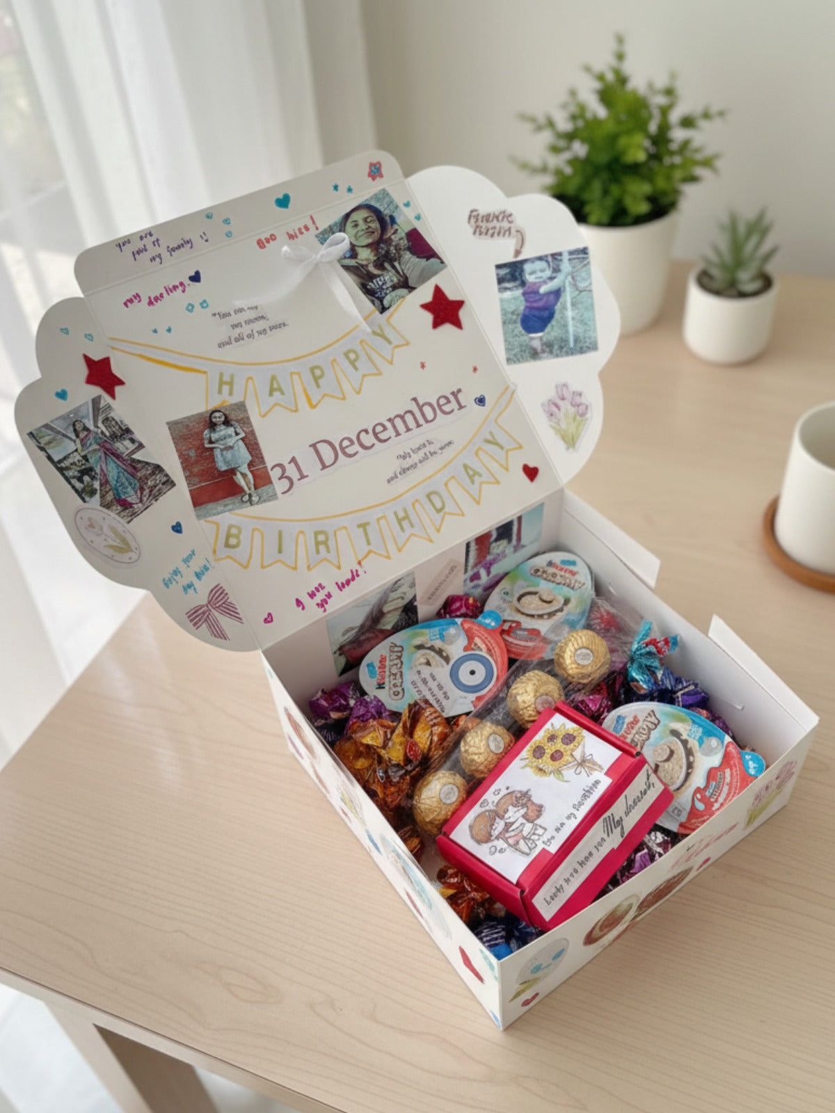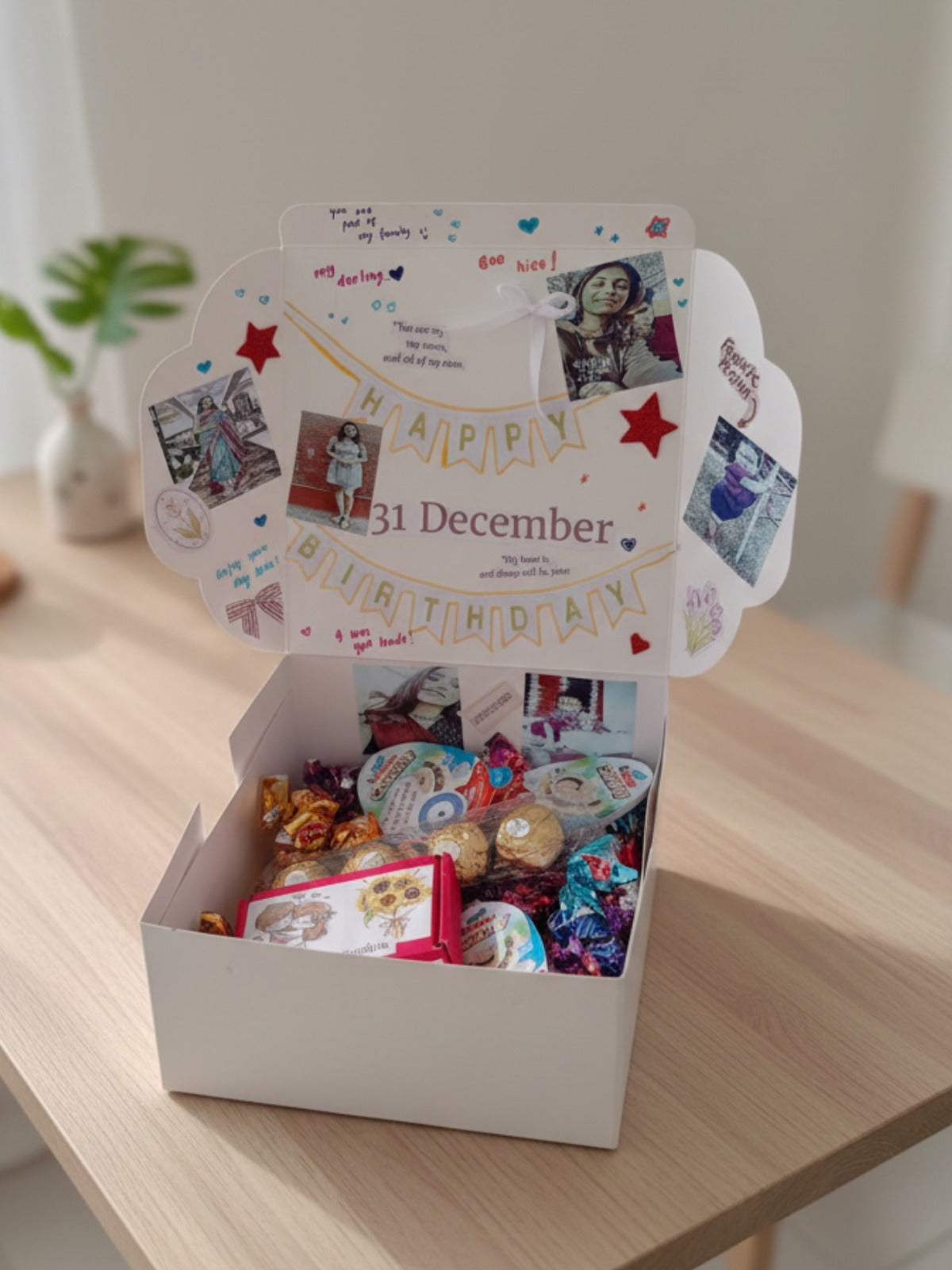 -The interior lid serves as a beautiful collage, featuring personal photos, hand-drawn stars, and sweet handwritten messages.