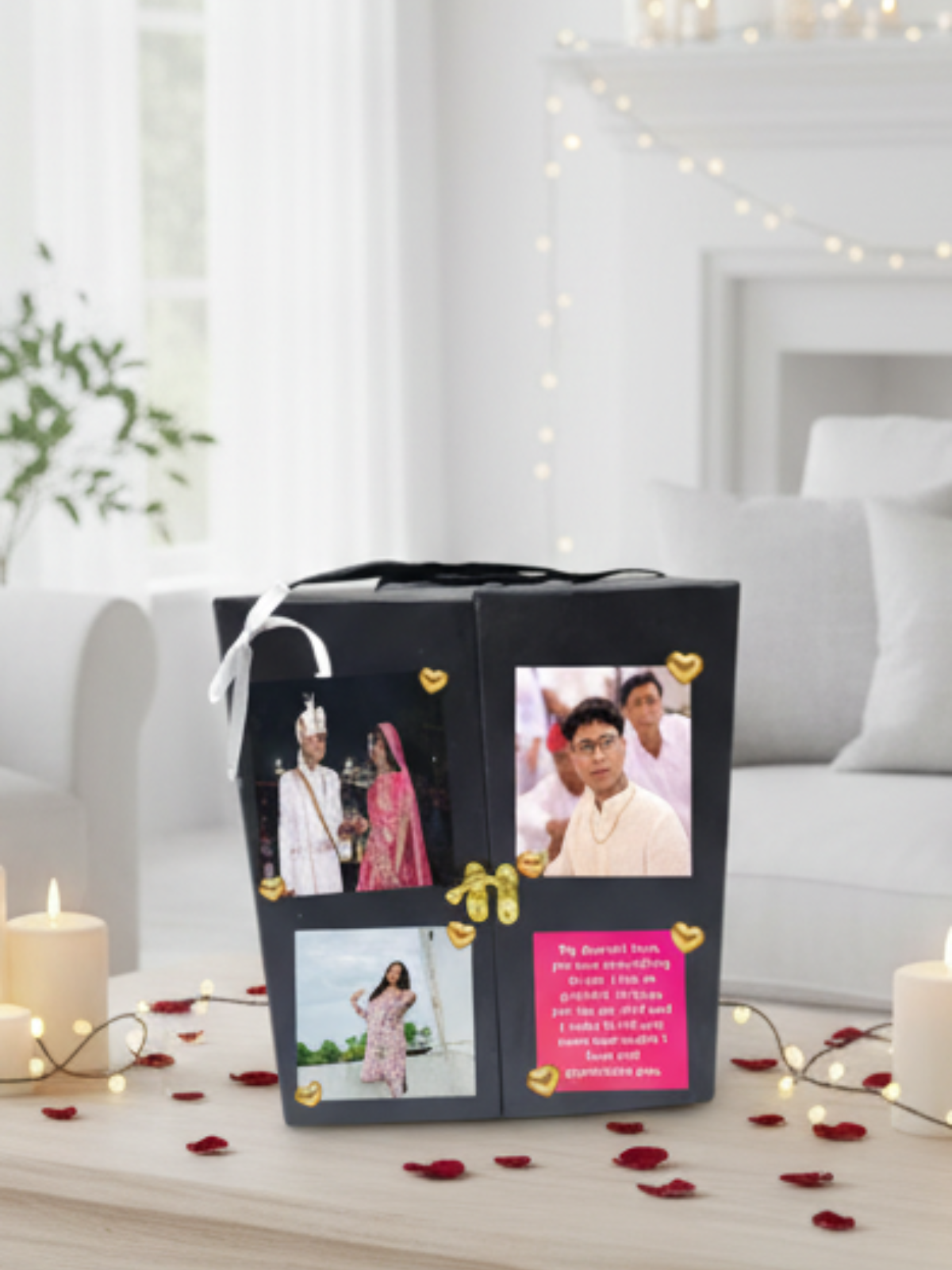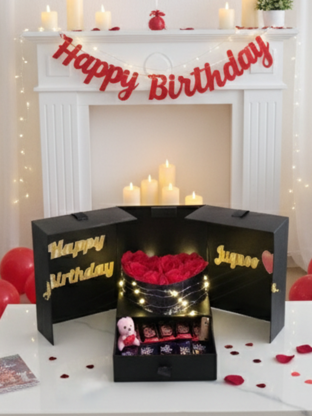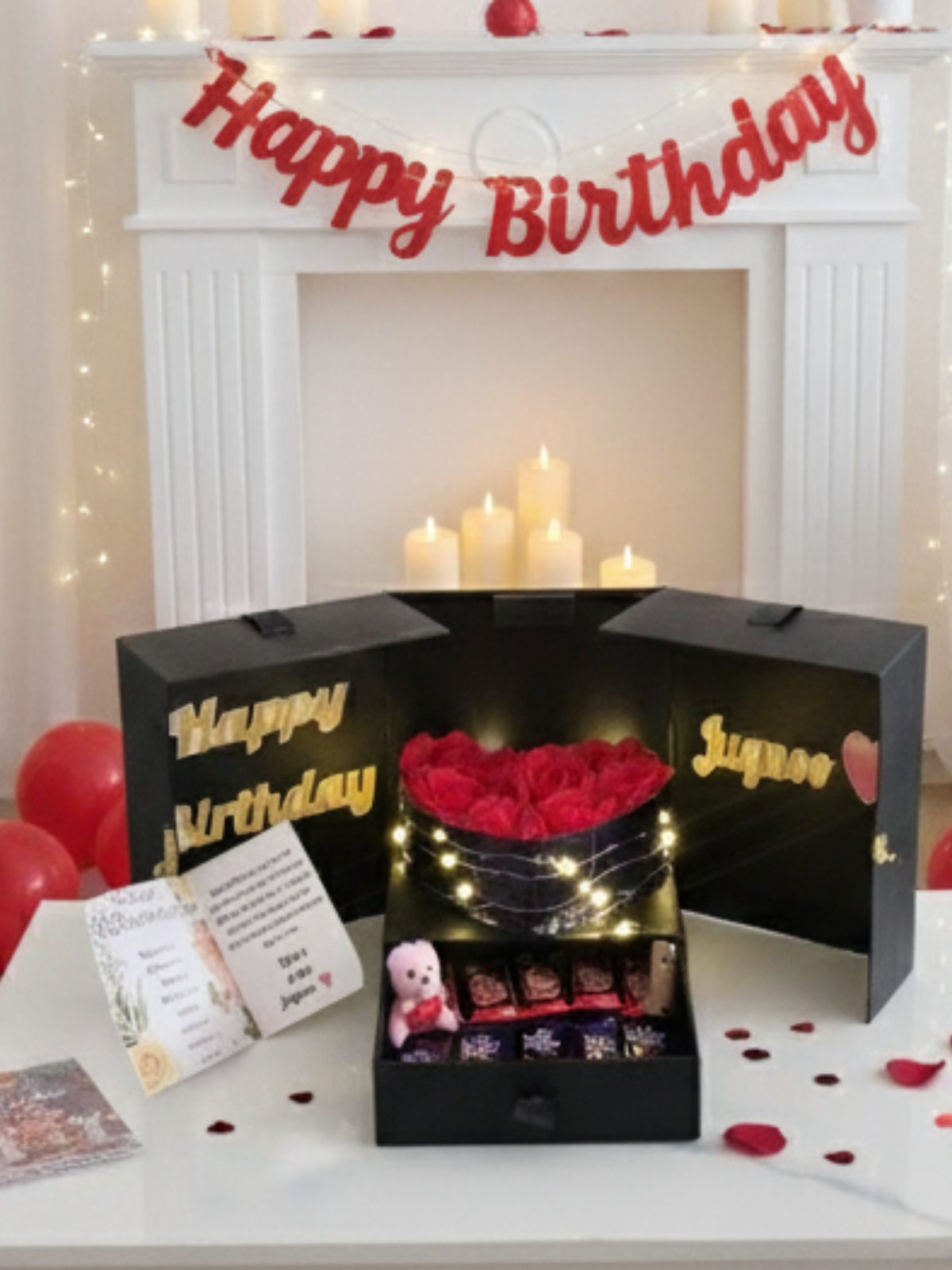 The Eternal Love box is the ultimate luxury and romantic gift for a birthday or anniversary. This large, black box opens to display personalized messages and a heart-shaped bed of red roses with twinkling lights. The drawer is filled with premium chocolates and a cuddly teddy bear. It's the perfect, unforgettable gesture of eternal love!