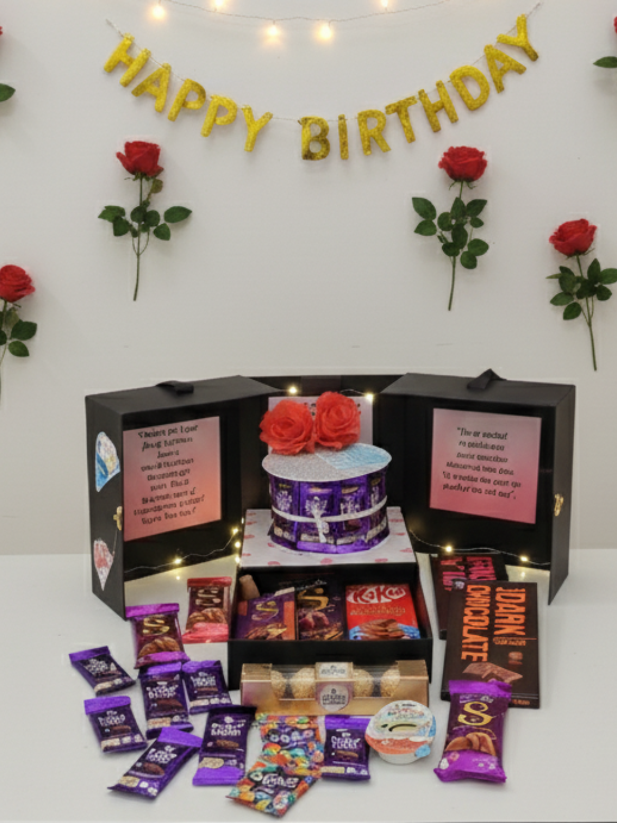 A delightful gift hamper designed to celebrate every special moment. Each box is filled with sweet indulgence and thoughtful surprises — from delicious chocolates to heartfelt keepsakes. Perfect for birthdays, anniversaries, proposals, or festive celebrations, these hampers are curated to express love, joy, and gratitude. Crafted with attention to detail, it’s the perfect way to make your loved ones feel truly special.
