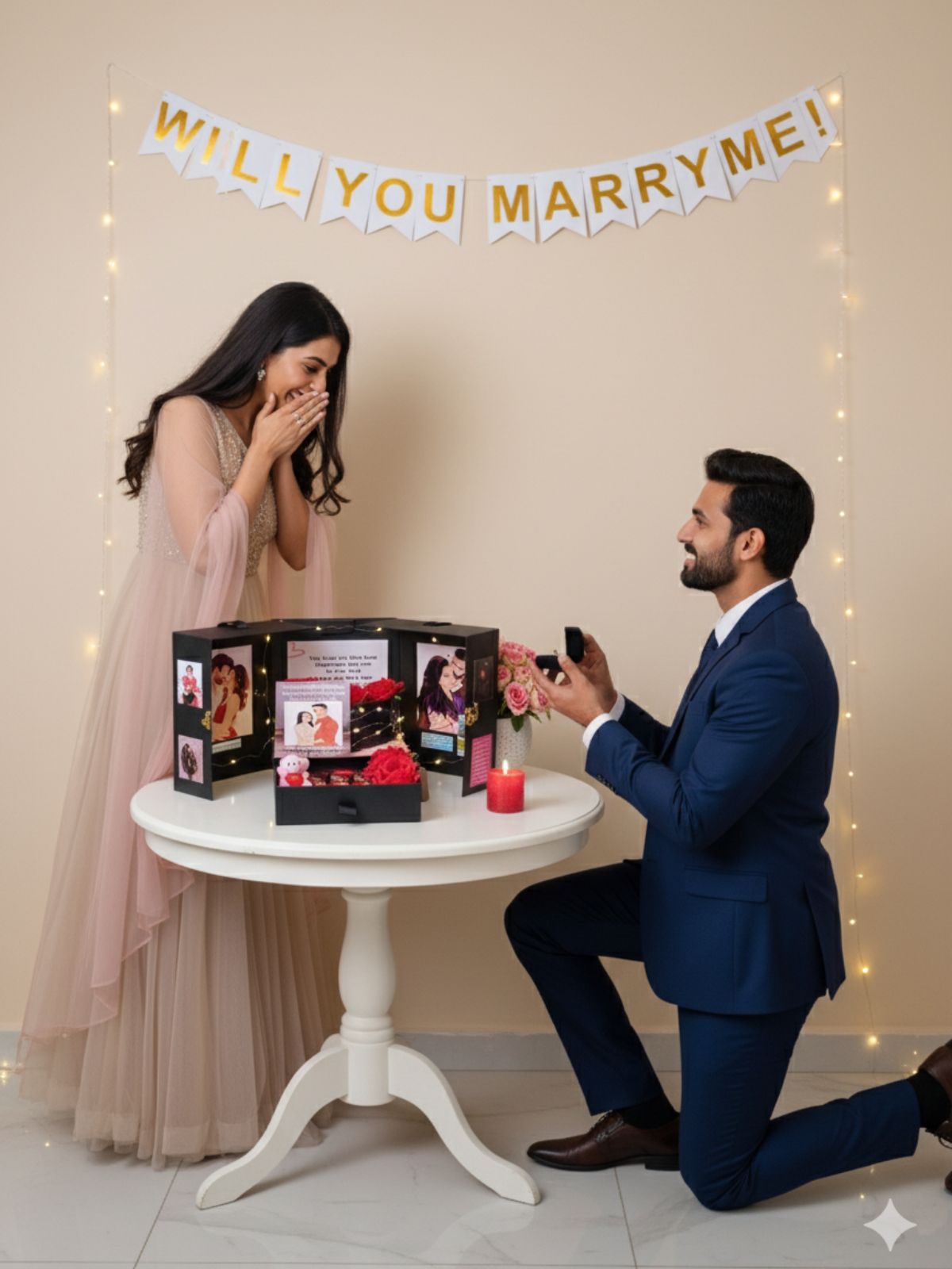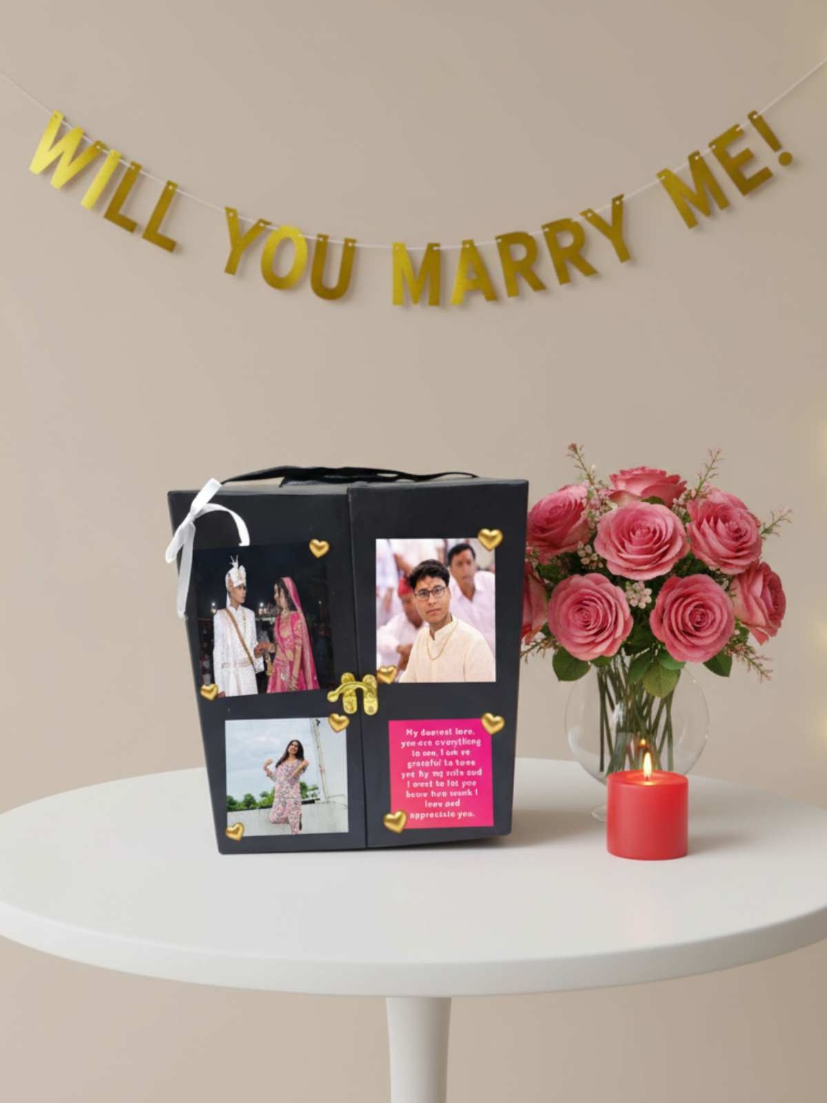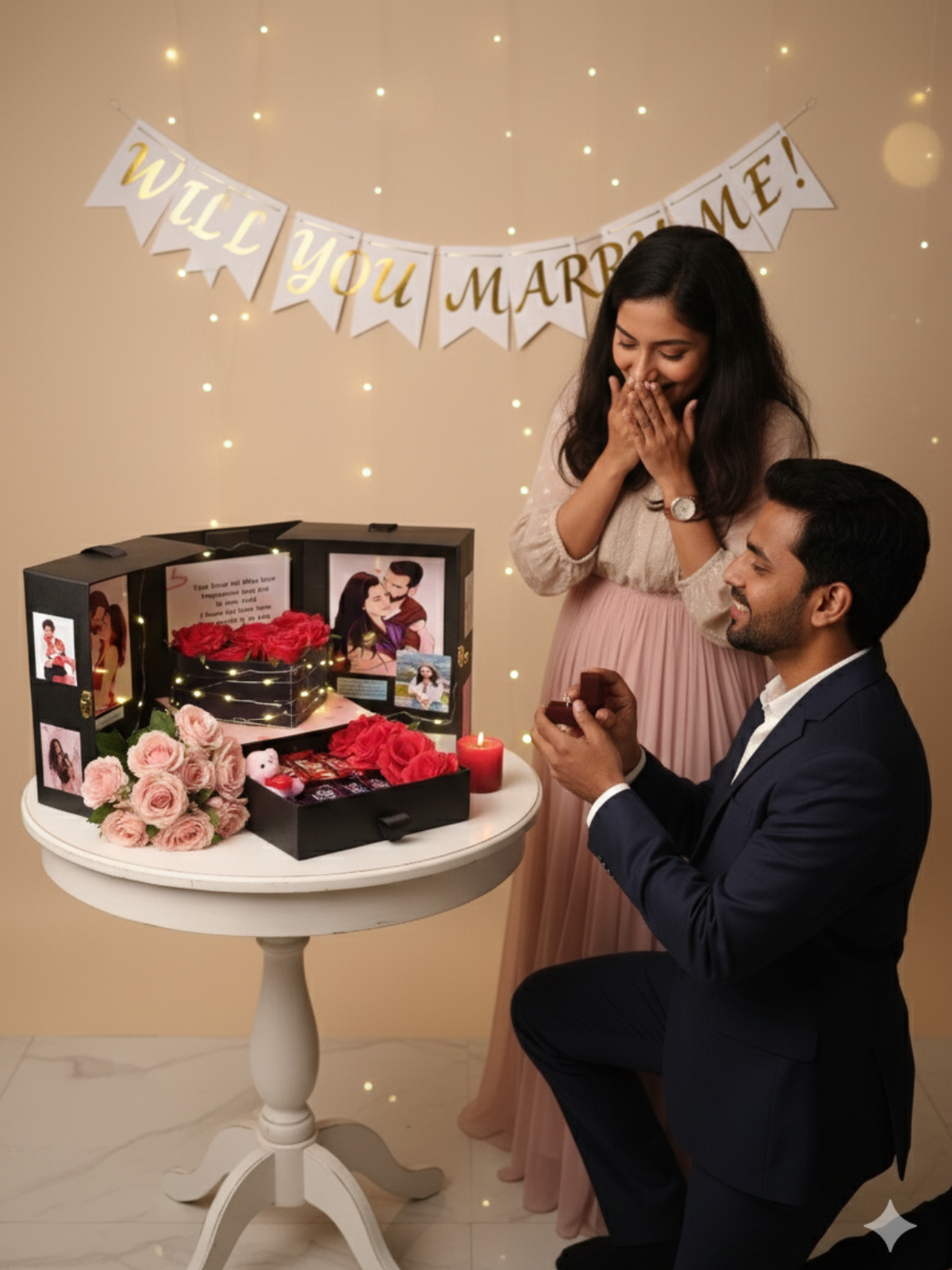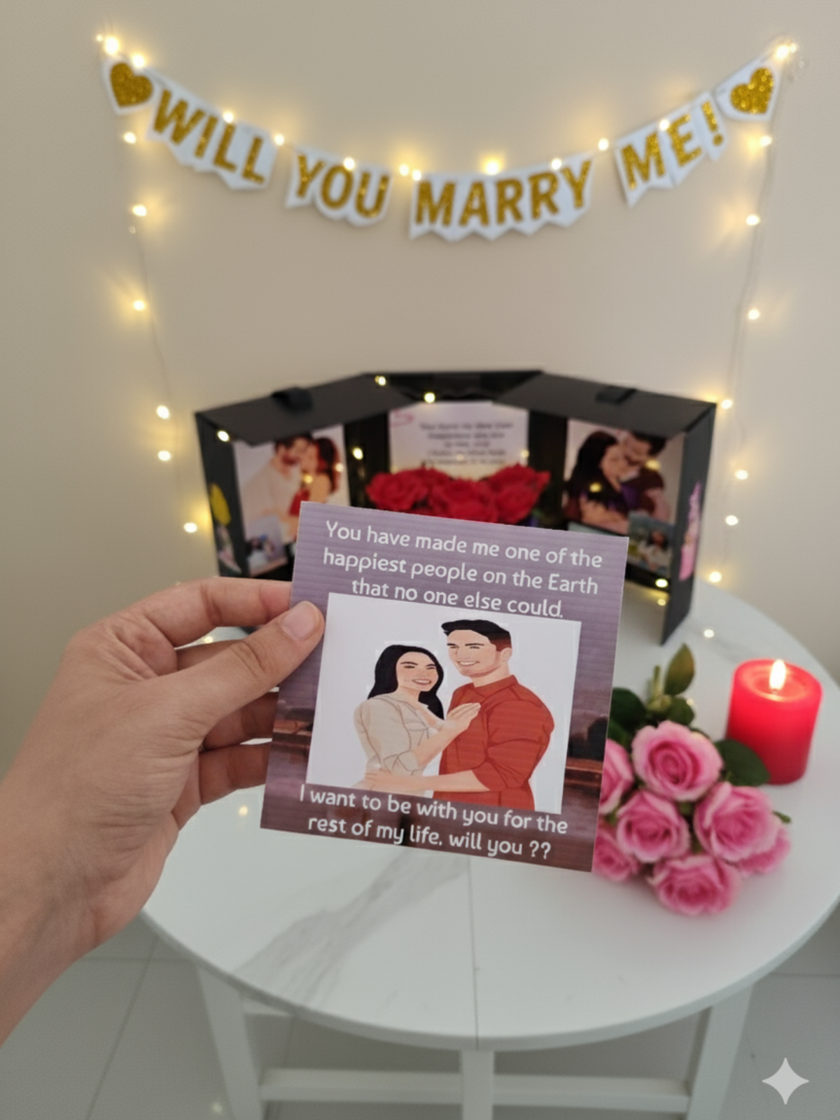 The Proposal Treasure is the ultimate, unforgettable setup for asking the most important question of your life! This luxury black gift box opens into a stunning, multi-panel display designed to hold photos and heartfelt messages, all illuminated by soft twinkling lights. Inside, a drawer hides the perfect spot for the ring, surrounded by romantic red roses and sweet treats. This is more than a gift; it’s the perfect backdrop that sets the scene for a "Yes" and creates a memory you'll both cherish forever. Make your proposal legendary—get The Proposal Treasure today!