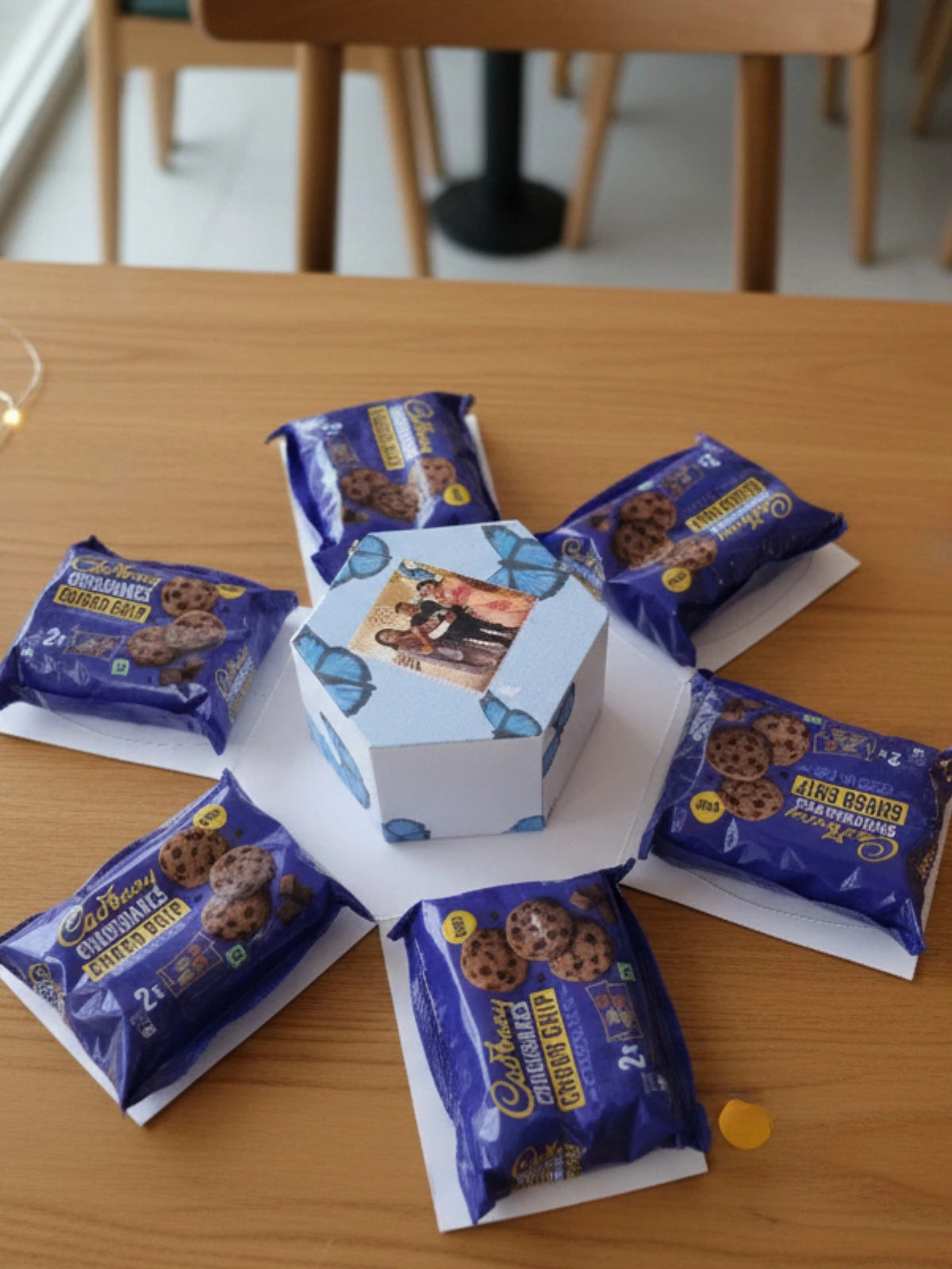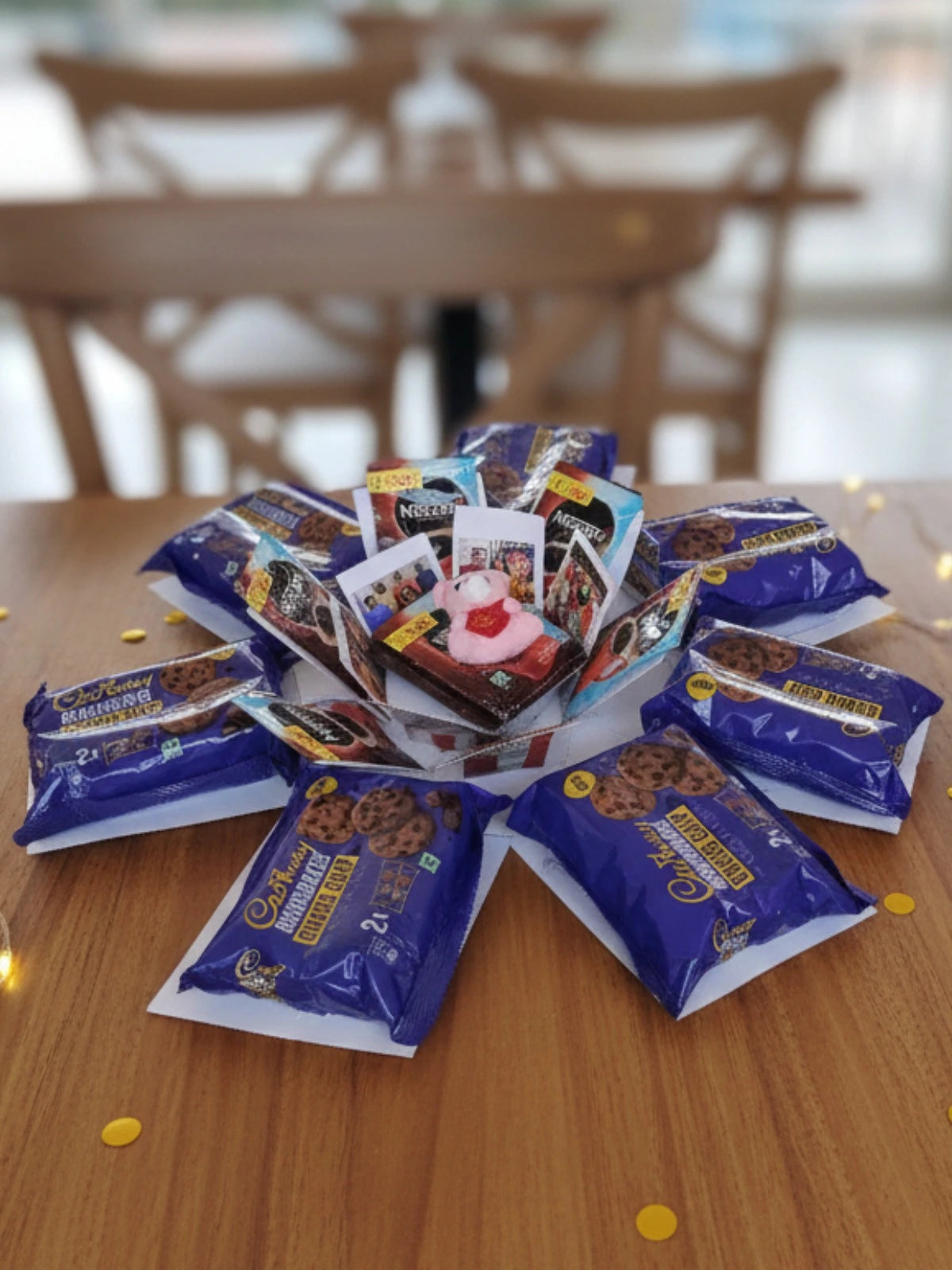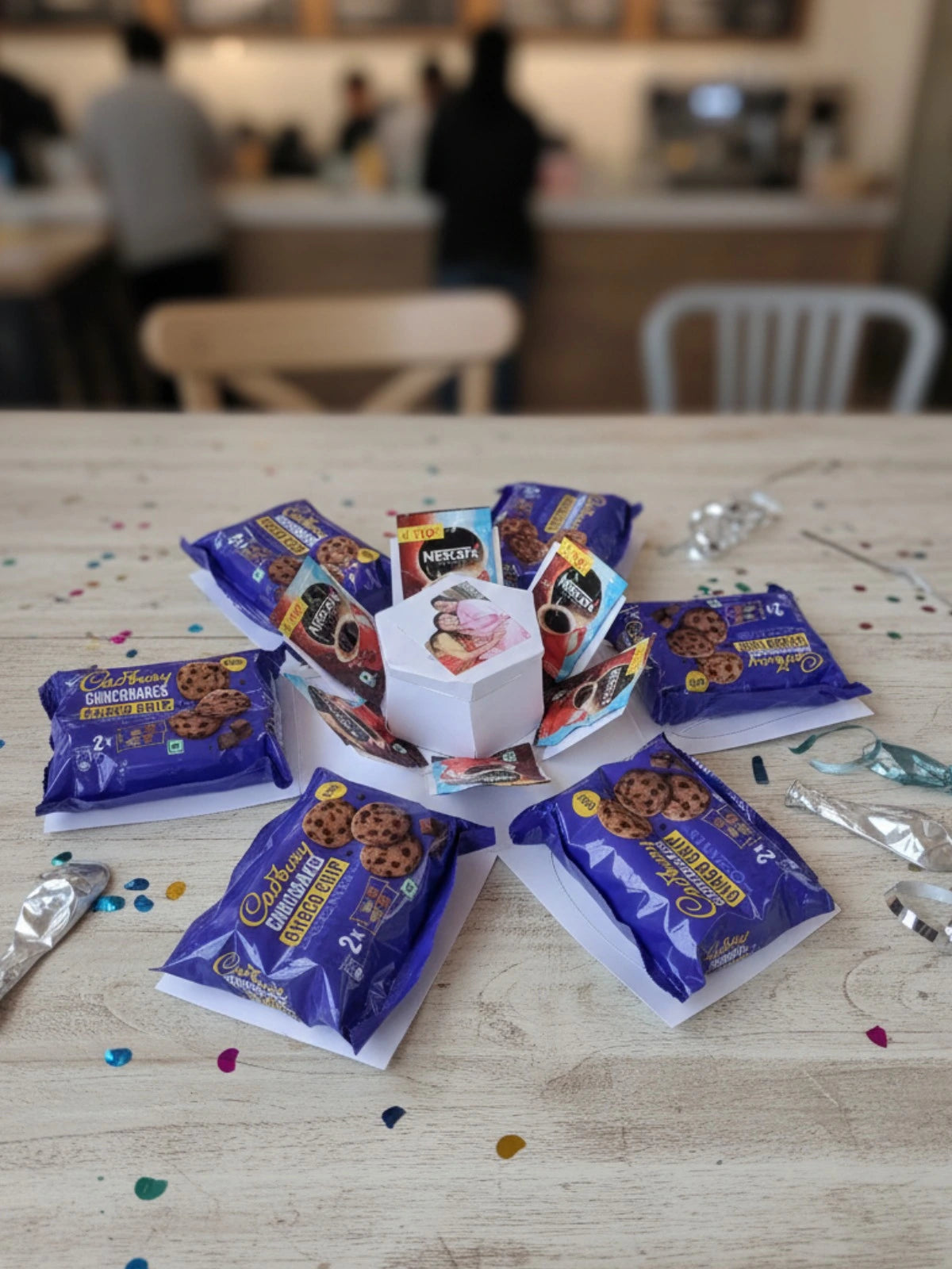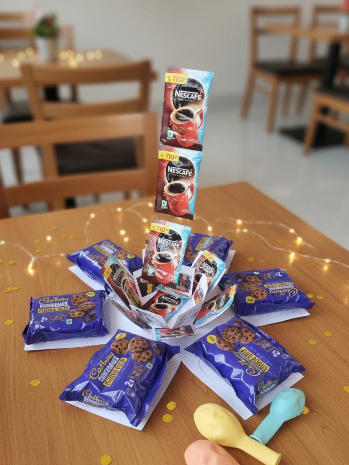 Surprise your loved ones with a unique gifting experience that blends coffee, cookies, and cherished memories! Our Coffee & Cookies Explosion Box opens up into a delightful display of Nescafé sachets, crunchy cookies, and personalized photo prints, all beautifully arranged around a handcrafted explosion box.