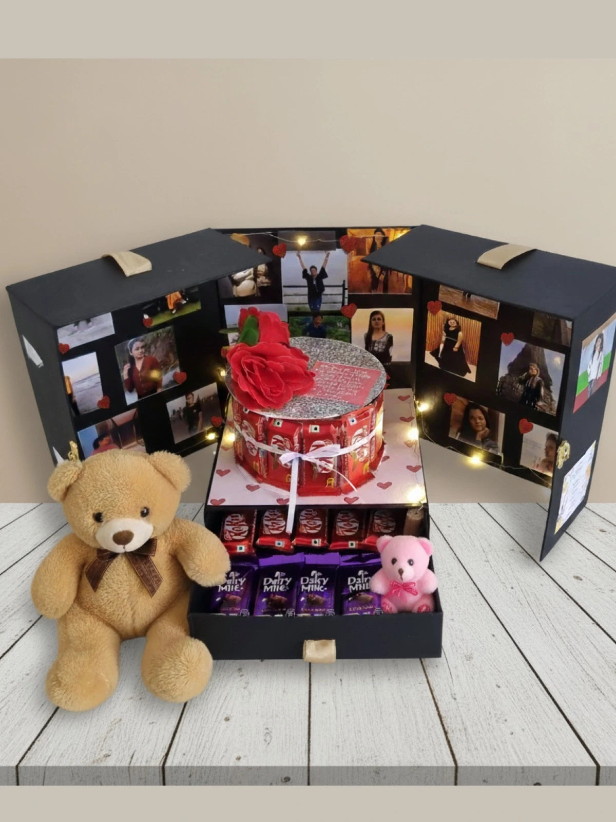 The Dairy Milk Bouquet is a unique, sweet twist on a traditional cake! This stunning, cake-style design is built entirely from classic Cadbury Dairy Milk bars and decorated with soft accents. It features prominent slots for your personalized photos, making it the perfect, indulgent gift to celebrate birthdays, friendships, or any happy occasion.