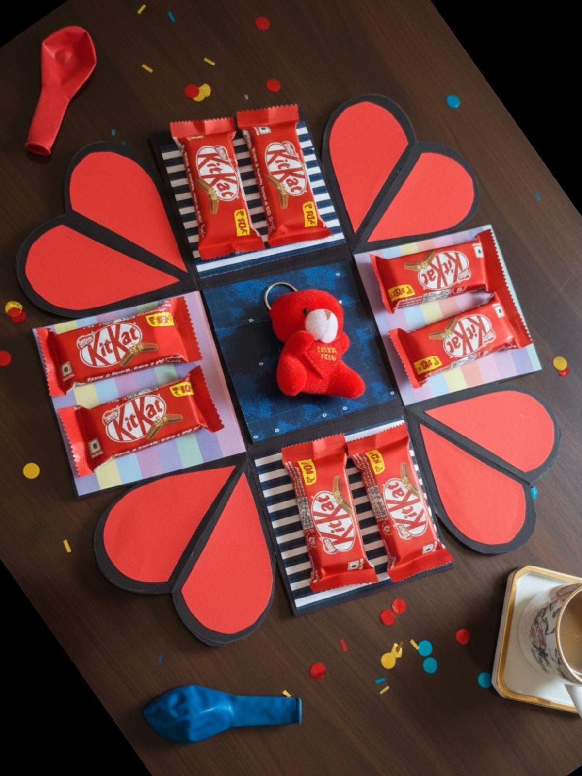 Make your loved one’s day extra special with our Heart Chocolate Explosion Box — a beautifully handcrafted surprise that opens into adorable heart panels filled with delicious chocolates and a cute teddy in the centre.